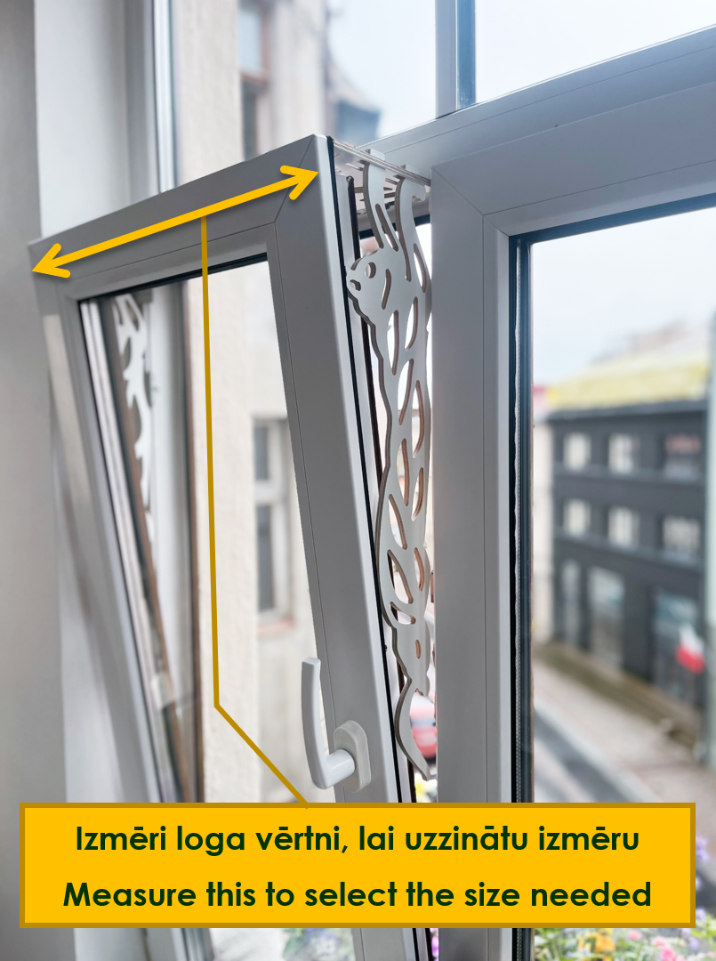NB! Lūdzu, nomēriet un pārbaudiet sava loga vērtnes izmērus pirms pasūtījuma veikšanas, lai pārliecinātos, ka mūsu produkts labi derēs jūsu logam, jo ir gadījumi, kad atgāžamā loga vērtne būtiski atšķiras no standarta, piemēram, sprauga vērtnes augšpusē ir platāka par 15 cm vai arī vērtne ir ļoti augsta (līdzīga balkona durvīm) u.tml.. Šajos gadījumos varam mēģināt rast individuālu risinājumu, tāpēc sazinieties ar mums epastā hello@kisskiss.lv